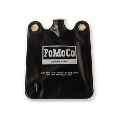 This part is a black windshield washer bag with white writing. Typically used on the Ford Mustangs. The nipple on these bags points down to feed the electric washer pump. Not correct for the foot operated. This bag is complete with the screw on cap.